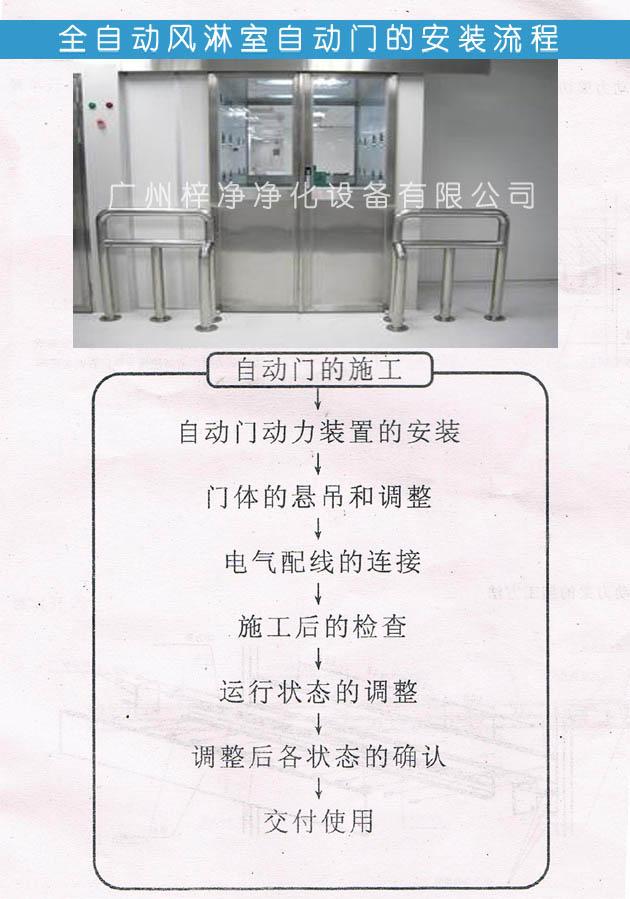 風(fēng)淋室安裝>>自動(dòng)門動(dòng)力裝置的安裝>>門體的懸吊和調(diào)整>>電氣配線的連接>>施工后的檢查>>運(yùn)行狀態(tài)的調(diào)整>>調(diào)整后各狀態(tài)的確認(rèn)>>交付使用。